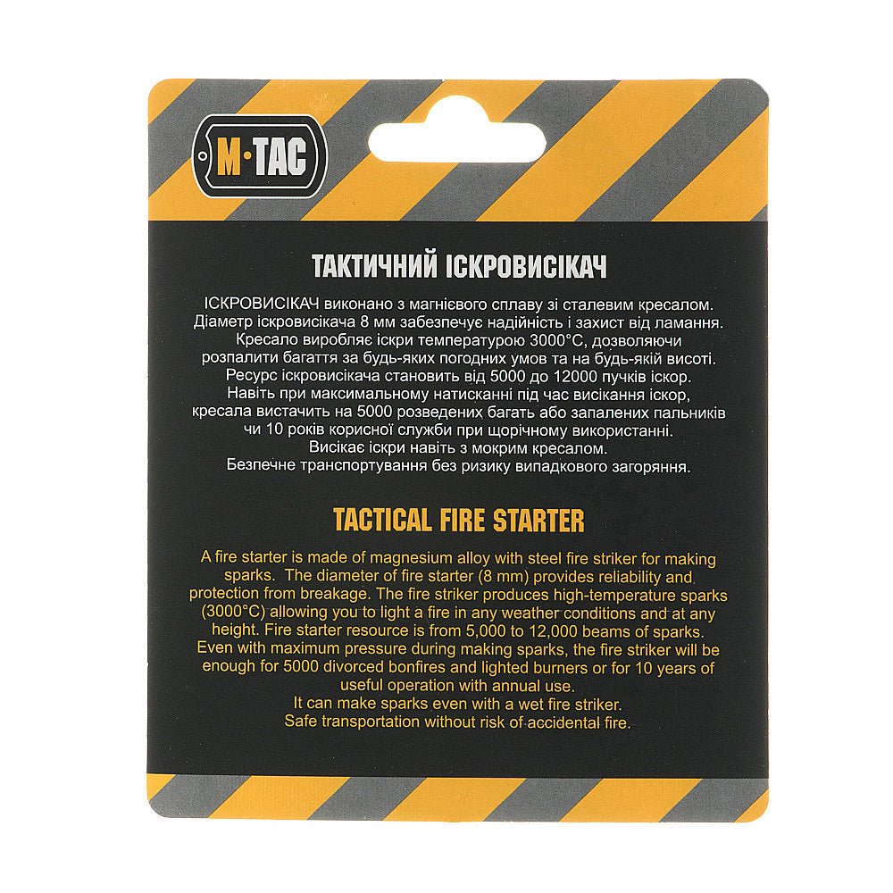 M-Tac zīmola taktiskās krama šķiltavas palīdzēs ātri un viegli iekurt uguni. Tā ir izgatavota no magnija sakausējuma ar 8 mm diametra tērauda plāksnīti. Tas rada ap 3000 dzirksteles un ļauj aizdegt uguni jebkuros laika apstākļos. Šķiltavas var radīt 5000 līdz 12 000 dzirksteļu.